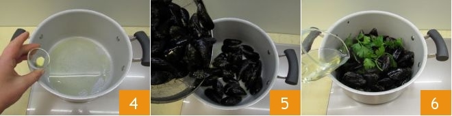 Vierte en una cacerola la mitad de la dosis indicada de aceite y añade un diente de ajo pelado y entero 4; deja que se dore y agrega los mejillones 5. Añade un ramillete de perejil entero y el vino blanco para desglasar 6,