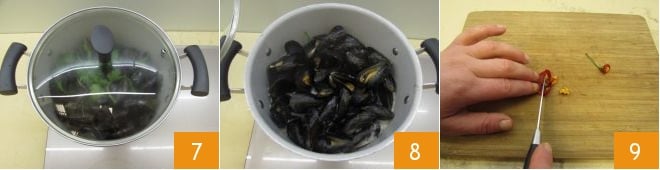 luego cubre con una tapa 7 y deja que los mejillones se abran 8: tomará unos 4 minutos, tan pronto como se abran podrás apagar el fuego. Mientras tanto, quita las semillas del chile y pícalo finamente 9.