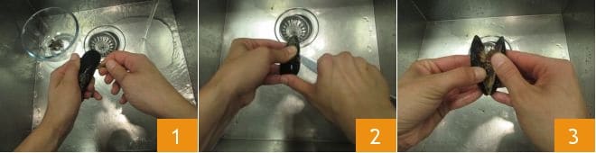 Para preparar los mejillones fritos, lo primero que hay que hacer es limpiar los mejillones. Una vez limpiada la concha con un estropajo y eliminada la barba interna 1, deberás abrirlos en crudo. Para hacerlo, bastará con mantener firme el mejillón con la mano izquierda y deslizar la hoja de un cuchillo entre las dos conchas empujando hacia afuera 2. Luego, abre las dos valvas, dejándolas unidas 3.