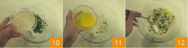 Añade también unos 40 g de pan rallado 10 y los huevos 11. Mezcla todo hasta obtener un compuesto uniforme 12.