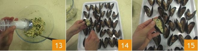 Ajusta de sal 13 y pimienta. En este punto será necesario ajustar el compuesto añadiendo más pan rallado según la cantidad de agua liberada por los mejillones hasta obtener una consistencia seca y compacta. Coloca los mejillones en una bandeja y rellénalos con aproximadamente 1 cucharadita del compuesto recién preparado 14 15, luego presiona el compuesto y cierra ligeramente las valvas.