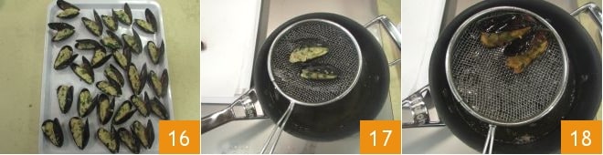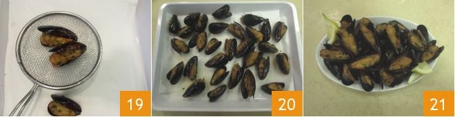 Transfiere los mejillones a un papel de cocina 19 y continúa friendo todos los demás 20. ¡Sirve tus mejillones fritos aún calientes 21!