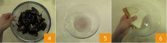 Coloca los mejillones abiertos dentro de un colador que habrás colocado sobre un bol y procede con la apertura de los demás mejillones 4. Ahora ocupaos del relleno: desplaza el colador con los mejillones conservando el agua que han soltado 5, luego añade el pan desmenuzándolo groseramente 6.