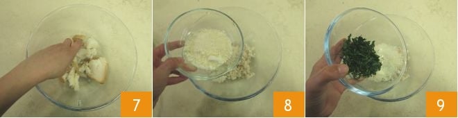Amasa todo con las manos 7, luego añade el Parmesano 8 y el perejil finamente picado 9.