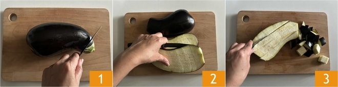 Para preparar las berenjenas en freidora de aire, comienza lavando las berenjenas. Luego colócalas en una tabla de cortar y quítales los extremos 1. Corta las berenjenas primero en rodajas 2, luego en bastones, finalmente comienza a cortarlas en cubos más o menos regulares de aproximadamente 1 cm 3.