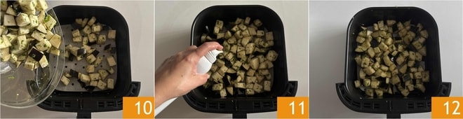 Coloca entonces las berenjenas en la cesta de la freidora de aire, puedes usar papel para horno, pero solo si tienes el papel perforado apropiado 10, en caso contrario, puedes prescindir de él. (nosotros hemos usado una freidora con capacidad de 6,5 litros). Una vez colocadas las berenjenas dentro de la cesta, rocía con aceite en spray o vierte un hilo de aceite 11 12.