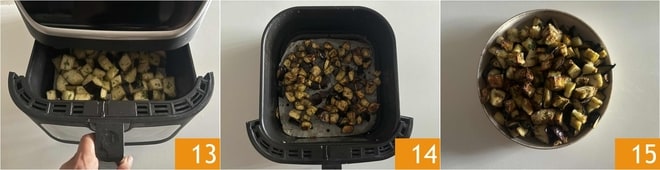 Cocina luego las berenjenas a 200° durante unos 15 minutos, teniendo cuidado de revisarlas a mitad de cocción 13 y si es necesario, revolverlas. Los tiempos pueden variar ligeramente dependiendo de la freidora y del tamaño de las berenjenas, evalúa el dorado y una vez doradas, estarán listas 14. Transfiérelas a un tazón pequeño y sirve tus berenjenas en freidora de aire 15.