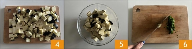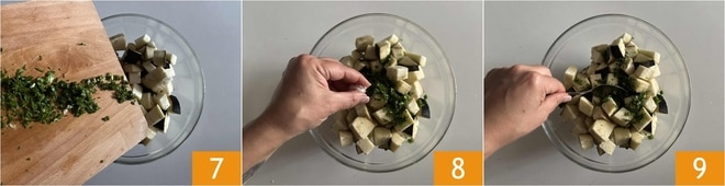 Cuando hayas obtenido tus cubos 4, transfiérelos dentro de un tazón 5. Pica finamente albahaca, perejil y ajo 6.