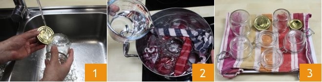 Para preparar los melocotones en almíbar comienza con la desinfección de los frascos y las tapas, como indican las directrices del Ministerio de Salud mencionadas al final de la receta. Lava los frascos bajo agua corriente 1 y colócalos en una olla de bordes altos. Introduce un paño limpio entre los frascos para evitar que se rompan al hervir y vierte agua hasta cubrir completamente los frascos 2. Calienta llevando a ebullición. Cuando el agua hierva, baja el fuego y continúa hirviendo durante 20 minutos. Luego, añade las tapas de los frascos a la olla y deja cocinar otros 10 minutos. Apaga el fuego y deja templar. Luego escurre los frascos sobre un paño seco 3.