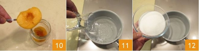 Coloca los melocotones en los frascos de vidrio previamente esterilizados con tapas "twist off" 10. Debe dejarse al menos un centímetro y medio desde el borde del frasco. En este punto, procede con la preparación del almíbar. En una cacerola de bordes altos, vierte agua 11 y azúcar 12. Calienta a fuego lento.