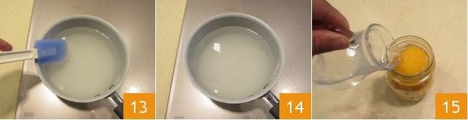 Mezcla con una espátula para disolver completamente el azúcar 13, luego hierve durante 2-3 minutos 14. Añade el almíbar a los melocotones en los frascos 15 hasta cubrir totalmente las frutas, pero parando a 1 centímetro del borde del frasco.