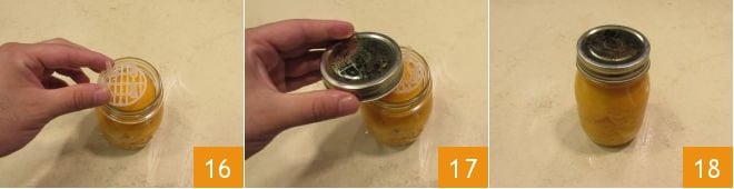 Coloca un prensador sobre los melocotones para comprimirlos ligeramente 16 y asegurarte de que no haya burbujas de aire. Sella los frascos enroscando cuidadosamente las tapas 17, pero sin apretar excesivamente y procede a la ebullición de los frascos, es decir, la pasteurización, siguiendo las indicaciones mencionadas en las directrices del Ministerio de Salud al final de la receta. Una vez que los frascos se hayan enfriado, verifica si el vacío se ha realizado correctamente: puedes presionar en el centro de la tapa y, si no escuchas el clásico "click-clack", el vacío se habrá realizado 18. ¡Tus melocotones en almíbar están listos para ser degustados!