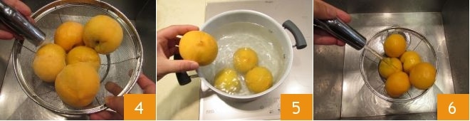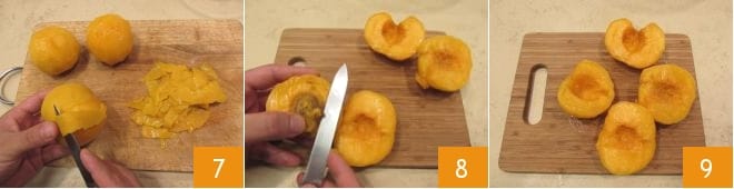 Procede lavando los melocotones 4. Luego toma una cacerola de bordes altos, llénala de agua y lleva a ebullición. Escalda los melocotones durante aproximadamente 2 minutos 5: deben resultar ligeramente ablandados pero aún firmes. Luego, ayudándote con una espumadera, transfiérelos a un colador. Enjuágalos bajo agua corriente para enfriarlos 6.