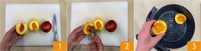 Para preparar los melocotones rellenos en freidora de aire, empieza cortando los melocotones por la mitad 1 para quitar el hueso 2, luego vacíalos ligeramente con la ayuda de una cucharita. Después colócalos en la freidora de aire 3, ajusta la temperatura a 200° y cocina durante 8 minutos.