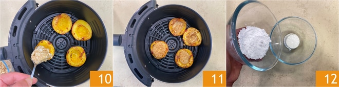 Rellena los melocotones 10, luego cocina en la freidora de aire a 200° durante otros 5 minutos (hemos utilizado una freidora con una capacidad de 6 litros). Cuando estén listos, sácalos de la freidora de aire y deja templar 11. Prepara la crema de ricotta añadiendo a la ricotta vacuna el azúcar glas 12.