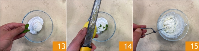 Rompe a mano algunas hojas de menta 13 y ralla la cáscara de limón 14. Mezcla todo brevemente para obtener una crema homogénea 15.