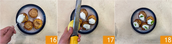Con la ayuda de 2 cucharitas, da forma de quenelle a la crema para distribuir un poco en cada melocotón relleno 16. Ralla nuevamente un poco más de cáscara de limón si lo deseas 17 y decora con hojas de menta 18. ¡Los melocotones rellenos en freidora de aire están listos para ser disfrutados!