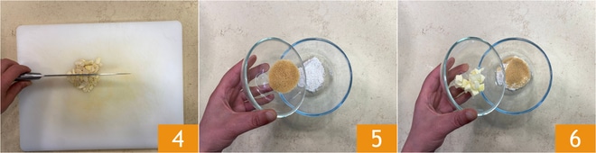 Mientras tanto prepara el crumble: pica finamente las almendras peladas 4. En un bol pequeño vierte la harina integral, el azúcar moreno 5, la mantequilla muy fría de la nevera cortada en cubos 6.