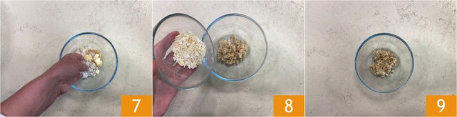 Con las yemas de los dedos trabaja los ingredientes 7 y, cuando estén homogéneos, añade también las almendras picadas 8. Trabaja rápidamente con las yemas de los dedos para no calentar demasiado la mantequilla, así el crumble estará listo 9.