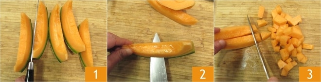 Para preparar el meloncello, primero cortad el melón en rodajas 1, quitad las semillas y la corteza 2, y cortad la pulpa en cubos 3. Necesitaréis aproximadamente 340 g de pulpa de melón.