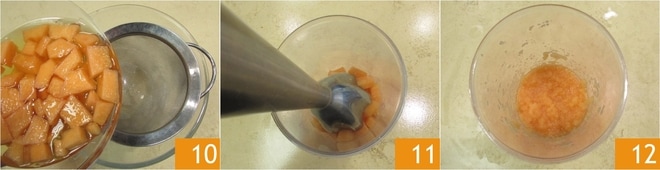Mientras tanto, filtrad el melón 10 y reservad el alcohol, luego triturad la pulpa con una batidora de mano 11 para reducirla a puré 12.