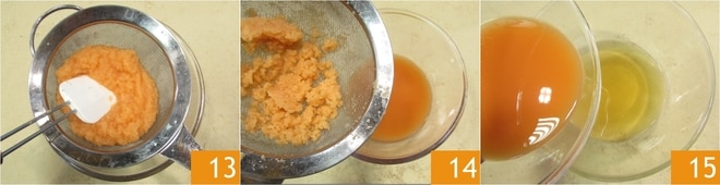 Colad el puré de melón presionando con una espátula a través de un colador 13 para separar la parte sólida de la líquida 14. Unid el líquido al alcohol reservado 15 y mezclad.
