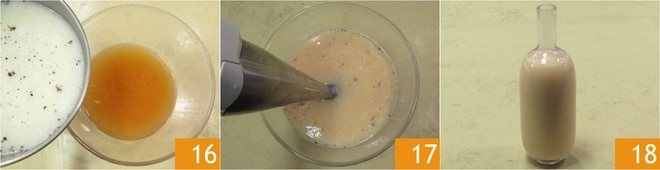 En este punto, verted la leche azucarada 16 y batid con la batidora de mano para mezclar todo 17. Transferid la mezcla a la botella, guardadla en el congelador y esperad aproximadamente 7-10 días antes de probar vuestro meloncello 18!