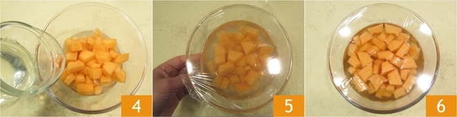 Transferid el melón a un bol y cubridlo con el alcohol 4, luego tapadlo con film transparente 5 y dejad macerar durante 8 días a temperatura ambiente, removiendo una vez al día 6.