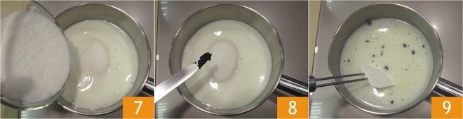 Transcurrido el tiempo de maceración, verted la leche y el azúcar en un cazo 7, añadid las semillas de la vaina de vainilla 8 y poned al fuego para disolver el azúcar, luego apagad y dejad enfriar 9.