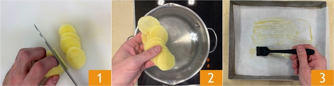 Para preparar la merluza al horno con patatas, primero pela las patatas y córtalas en rodajas finas 1. Escalda las patatas en agua con sal durante 5 minutos 2, luego escúrrelas. Mientras tanto, pica finamente el ajo y cubre 2 bandejas con papel de horno, untando la parte central con un poco de aceite 3.