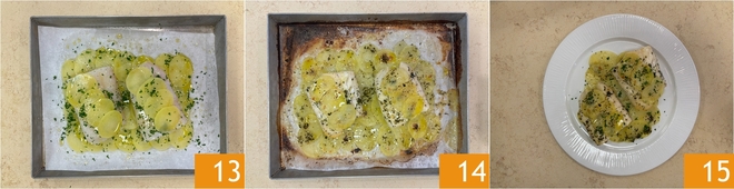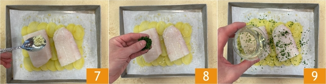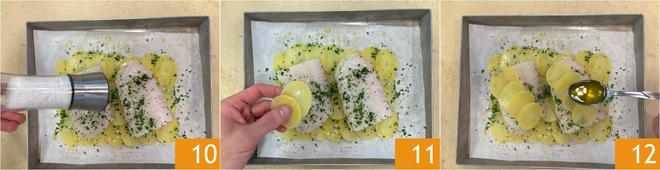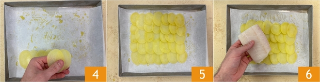 Toma la primera bandeja: coloca una capa de patatas, superponiéndolas ligeramente 4, de manera que formes un rectángulo lo suficientemente grande para acomodar 2 filetes 5. Luego, coloca encima el pescado 6.