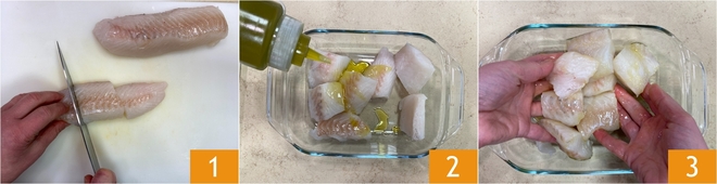 Para preparar la merluza en freidora de aire corten los filetes de pescado en trozos más pequeños, de unos 6 cm 1. Coloque los trozos de pescado en una fuente y sazone con el aceite de oliva virgen extra 2, masajéelos bien para engrasarlos uniformemente 3.
