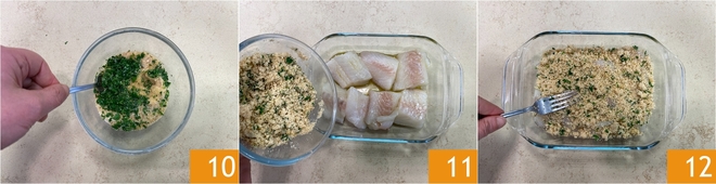 Mezclen bien el empanado 10 y viertan la mitad sobre los trozos de merluza 11, mezclen bien para que el pan rallado se adhiera 12.