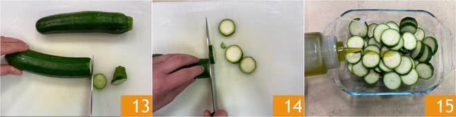 Laven y corten las puntas de los calabacines 13, luego córtenlos en rodajas de aproximadamente medio centímetro de grosor 14. Colóquenlos en un bol y sazone con aceite de oliva virgen extra 15.