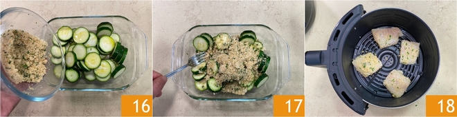 Viertan la restante mezcla de empanado aromatizado 16 y mezclen para que se adhiera bien a los calabacines 17. Ahora coloquen los trozos de pescado en el cestillo de la freidora de aire 18 (nosotros utilizamos una freidora con capacidad de 6 litros). Ajusten según el tamaño de su freidora, el pescado no debe superponerse; si la freidora no es lo suficientemente grande, puede ser necesario cocinar en varias tandas.