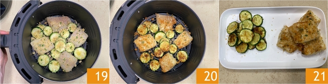 Viertan entre los espacios vacíos también las rodajas de calabacín empanadas 19, tratando de no superponerlas demasiado. Cocinen durante 15 minutos a 180°, hasta que estén doradas 20. La merluza en freidora de aire está lista para ser degustada con los crujientes calabacines 21