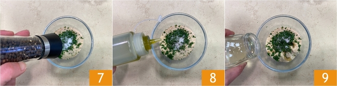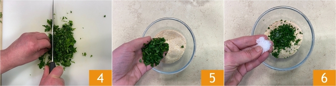 Piquen el perejil 4 y agréguenlo al pan rallado 5, salan el empanado 6.