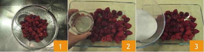 Para preparar la mermelada de frambuesas, aseguraos de haber sanitizado los tarros que vais a utilizar, siguiendo las indicaciones al final de la receta. Laváis bien las frambuesas bajo agua corriente. Luego dejadlas escurrir en un colador y colocadlas en una fuente. Exprimid el zumo de limón, tamizadlo y rociad las frambuesas 2, añadid el azúcar 3 y mezclad bien.