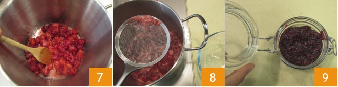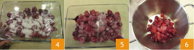 Cubrid con film transparente 4 y dejad macerar las frambuesas por al menos 4 horas en el frigorífico (mejor aún si es toda la noche). Pasado este tiempo, recuperad la mezcla 5 y transferidla a una olla 6.
