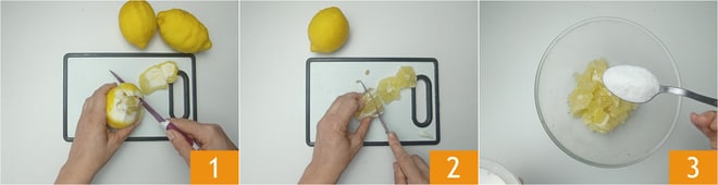 Para preparar la mermelada de limones sin piel, primero elige limones de excelente calidad y con una piel gruesa. Lávalos, sécalos y pélalos al vivo 1. Córtalos en rodajas 2 y colócalos en un bol poco a poco. Necesitarás 500 g. Luego, añade el azúcar 3, mezcla y pon en el frigorífico durante 4 horas cubriendo con film transparente.