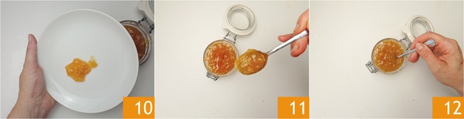 Antes de apagar el fuego, puedes hacer la prueba del plato: basta con verter una cucharadita en un plato e inclinarlo; si la mermelada no se desliza rápidamente, significa que está lista. Envasa la mermelada en tarros esterilizados 11 12.