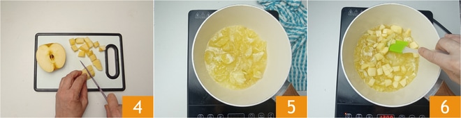 Después de las 4 horas, pela la manzana y córtala en cubitos 4, necesitarás 100 g. Vierte los limones, junto con el líquido de maceración, en una olla 5, añade también la manzana 6 y cocina a fuego lento, removiendo de vez en cuando durante unos 20 minutos.