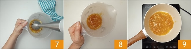 A mitad de cocción, tritura la mermelada con una batidora de mano 7, de este modo quedará suave 8. Vuelve a colocarla en la olla y cocina durante otros 20 minutos hasta que alcance la consistencia deseada 6, teniendo en cuenta que una vez fría será más sólida.