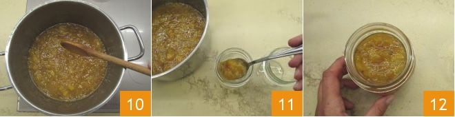 hasta que la mezcla alcance, en el tiempo indicado, los 108°; para monitorear la temperatura, utiliza un termómetro para alimentos. Tan pronto como la confitura esté lista 10, viértela aún caliente en los frascos recién sanitizados 11, llenándolos hasta 1-2 cm del borde 12.