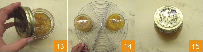 Procede a enroscar bien los frascos con tapas nuevas 13, luego colócalos boca abajo y deja enfriar completamente la confitura 14. Antes del consumo 15, asegúrate de que las tapas no hagan el típico "click-clack" al presionar en el centro, señal de que el vacío no se ha realizado correctamente. Para estas y otras indicaciones, remitimos a la información sobre conservas caseras del Ministerio de Salud.