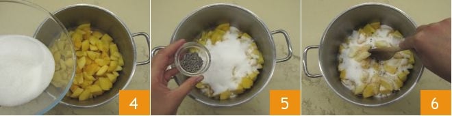 Para realizar la confitura de melocotón y lavanda asegúrate de usar tarros intactos, tapas nuevas y proceder a la sanitización como se indica en el cuadro al final de la receta. Luego pela los melocotones 1 y córtalos en trozos eliminando el hueso central 2. Coloca los melocotones cortados en una olla de acero 3.