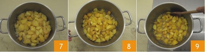 para sazonar bien los melocotones 7. En este punto tendrás que dejar macerar la fruta, cubriendo la olla con film transparente y colocando en el frigorífico durante una hora. Transcurrido este tiempo, retoma los melocotones que habrán liberado su líquido durante la maceración 9 y colócalos en el fuego a cocinar durante unos 40 minutos a fuego medio, mezclando a menudo