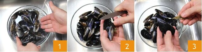 Para preparar los tiburoncitos con salsa al lemongrass, comienza con la limpieza de los mariscos. Toma primero los mejillones, colócalos en un recipiente grande y enjuágalos bajo agua corriente fresca 1. Con el dorso de una cuchilla elimina todas las incrustaciones 2 y, con un movimiento enérgico, arranca la barba, o biso, que sobresale de las valvas 3.