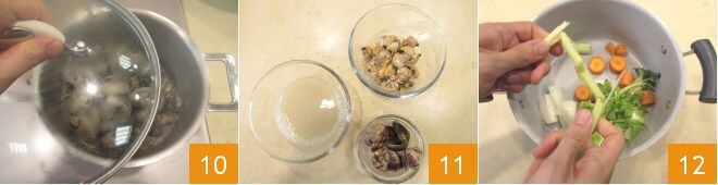 Cubre con una tapa 10, y cocina las almejas a fuego alto hasta que se abran por completo. También en este caso no necesitarán más de 5 minutos. Después de dejarlas enfriar un poco, procede a quitar las conchas de las almejas, teniendo cuidado de recoger y conservar también el líquido producido durante la cocción 11. Continúa con la otra preparación larga prevista para esta receta: el caldo de verduras. Coloca cebolla, apio, zanahoria y lemongrass en una olla 12.