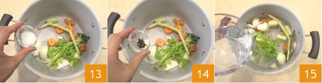 Y añade también la sal gruesa 13 y la pimienta en grano 14, luego cubre con agua 15, y deja hervir durante al menos media hora.